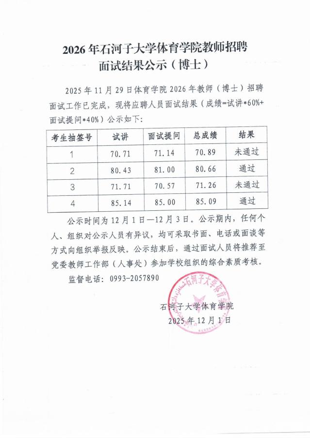 2026年石河子大学体育学院博士教师招聘面试结果公示