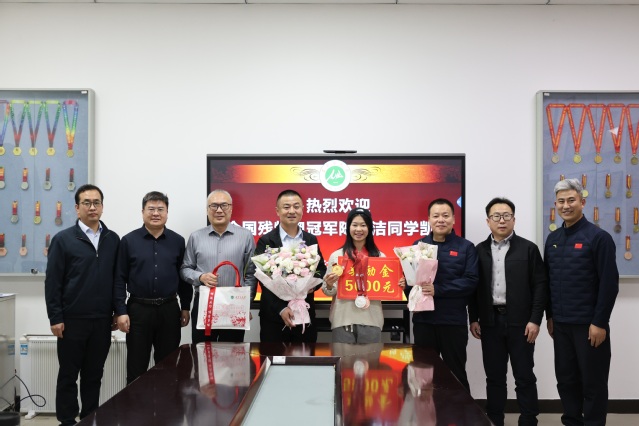 12月18日,在全国第十二届残疾人运动会暨第九届特殊奥林匹克运动会中斩获3枚奖牌的陈玥洁同学载誉返校。校党委常委王虎挺代表校党委看望慰问陈玥洁同学,为她送上鲜花、奖励金及学校文创用品。