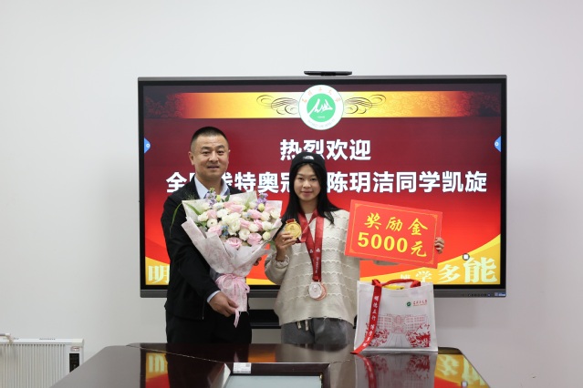 陈玥洁同学对学校和学院的悉心培养和关心表示衷心感谢,她表示,正是学校、学院一如既往地支持、教练员的悉心指导以及队友们的关心帮助,让自己得以全身心投入训练、安心备赛,最终圆了冠军梦想,在今后的学习训练中,将不断克服困难、超越自我,为校争光。