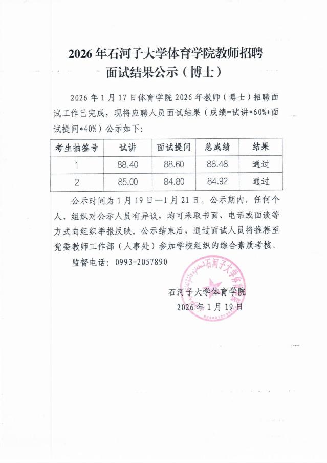 2026年石河子大学体育学院教师面试结果公示(博士)